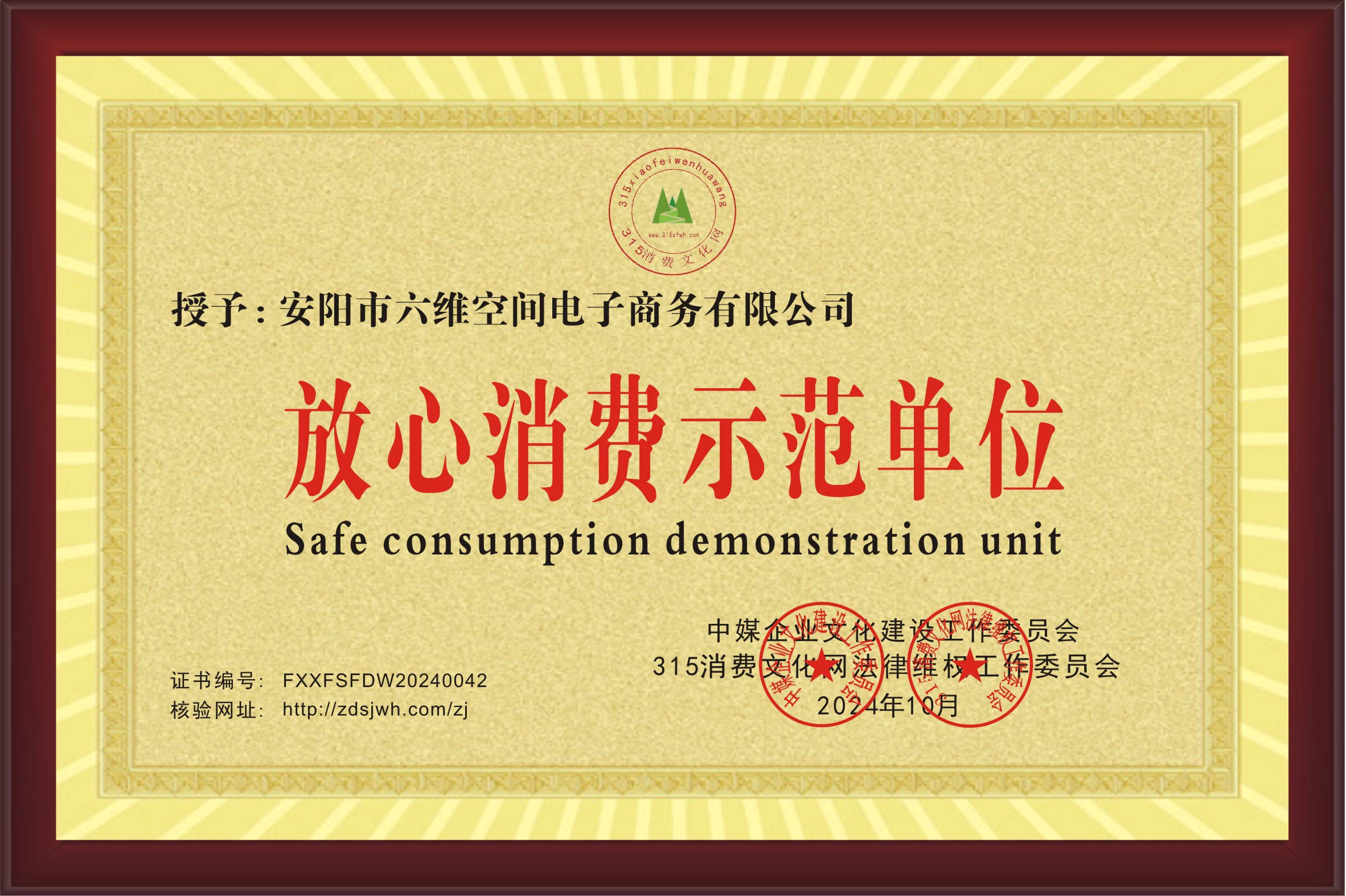 熱烈祝賀安陽市六維空間電子商務(wù)有限公司被授予“放心消費(fèi)示范單位”。