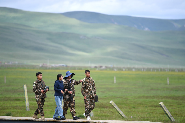 ??在位于甘肅省甘南藏族自治州的尕海則岔國(guó)家級(jí)自然保護(hù)區(qū),管護(hù)中心尕海保護(hù)站的工作人員在保護(hù)區(qū)內(nèi)巡護(hù)(2023年7月7日攝)。新華社記者陳斌 攝
