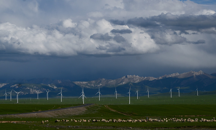??羊群在青海省海西蒙古族藏族自治州天峻草原的一處風(fēng)電場(chǎng)附近漫步、吃草。新華社記者張龍 攝