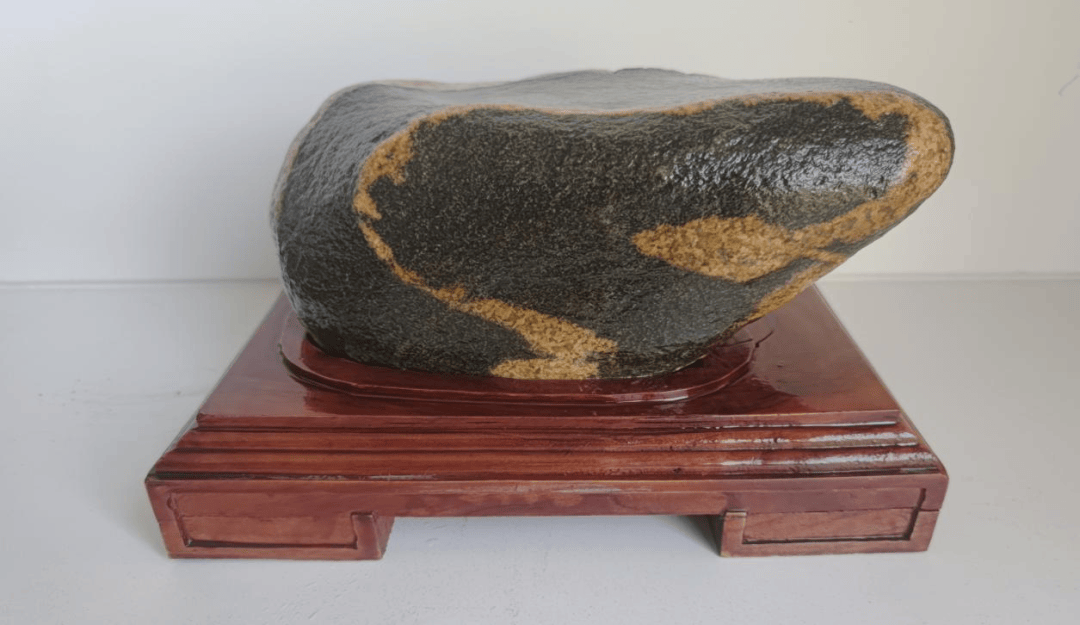 伴隨著辭舊迎新的鐘聲,泰山奇石——“靈蛇獻(xiàn)瑞”展示在人們的面前。這是一塊純正的泰山水沖原石,奇石寬32厘米,高24厘米,厚16厘米。石體完整,形態(tài)自然。色呈褐黑,質(zhì)地堅(jiān)硬。密實(shí)細(xì)膩,油光明亮。整條蛇體由金黃色的透筋龍紋構(gòu)成,比例協(xié)調(diào),彎曲有致。蛇身環(huán)繞奇石一周,三角形的頭部,傲立于奇石右上方,尾部位于石體左下,與大地似斷且連,看上去仿佛像一條剛蛻去蛇皮,重獲新生,智慧昂揚(yáng)的靈蛇,給人以信心和力量。
