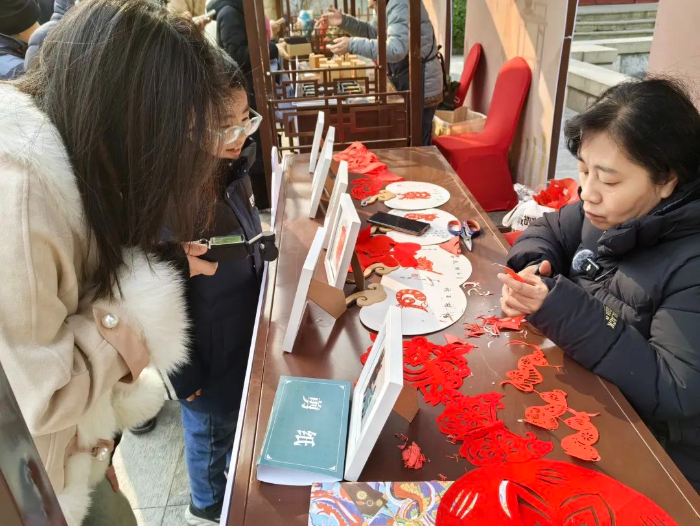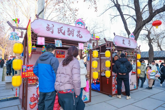??五龍?zhí)豆珗@結(jié)合傳統(tǒng)的秦瓊祈福文化活動(dòng),在青泉廣場(chǎng)和玉泉廣場(chǎng)設(shè)置非遺文創(chuàng)市集,春節(jié)期間氛圍熱烈,年味濃郁。面塑、剪紙、皮影、草木香囊、木版年畫(huà)等非遺好物匯聚一堂,精美的手工藝制作令現(xiàn)場(chǎng)游客驚嘆不已,眼界大開(kāi)。