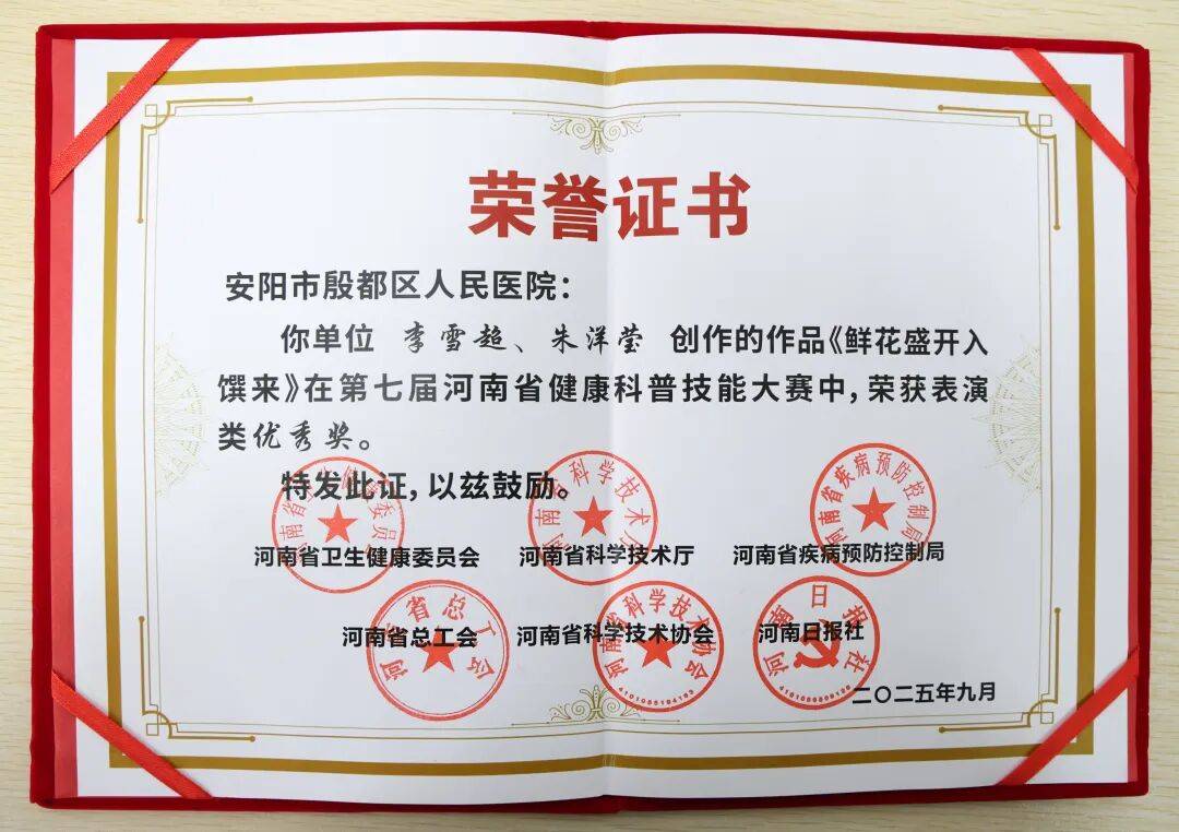 在省級賽場中,我院醫(yī)護人員同樣展現(xiàn)出強勁的競爭力。由河南省衛(wèi)生健康委員會、河南省科學技術廳、河南省疾病預防控制局、河南省總工會、河南省科學技術協(xié)會、河南日報社聯(lián)合主辦的河南省第七屆健康科普技能大賽,作為全省健康科普領域的權威賽事,吸引了來自全省各級醫(yī)療機構的千余件科普作品參賽。大賽涵蓋表演類、圖文類、視頻類等多個類別,通過層層篩選、專家評審的嚴格流程,最終評選出各類優(yōu)秀作品。其中,我院李雪超、朱洋瑩共同參與的科普作品《鮮花盛開入饌來》,以創(chuàng)新的表演形式普及藥食同源知識,將傳統(tǒng)養(yǎng)生智慧與現(xiàn)代健康理念相結合,內容實用、形式新穎,最終榮獲表演類優(yōu)秀獎,為我院在省級健康科普領域贏得了榮譽。