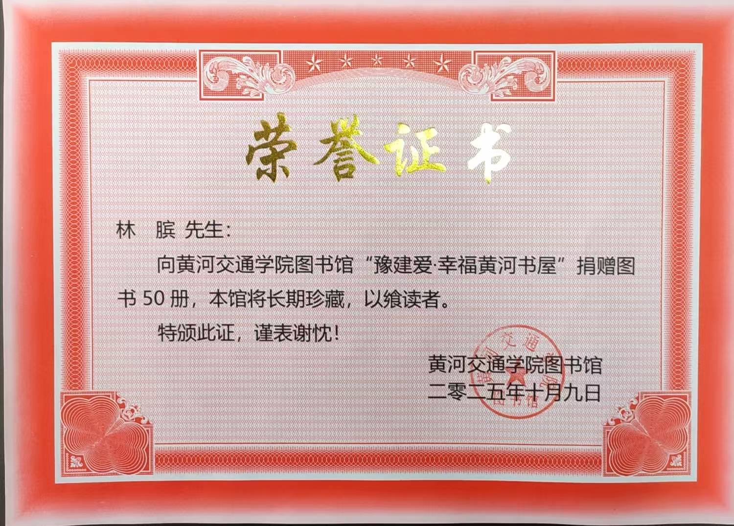 近日,為深入貫徹落實民建河南省委會關(guān)于向黃河交通學(xué)院捐助建設(shè)“豫建愛?幸福黃河書屋”工作部署,助力沿黃地市高校建設(shè),中研文化藝術(shù)工作委員會主席、民建安陽市委會信息宣傳委員會主任、北關(guān)區(qū)政協(xié)常委、中大視界文化傳媒產(chǎn)業(yè)(北京)有限公司董事會主席林臏,向黃河交通學(xué)院捐贈50冊精選圖書。此次捐贈不僅為青年學(xué)子搭建了優(yōu)質(zhì)閱讀平臺,更以實際行動彰顯了民建會員的責(zé)任與擔(dān)當(dāng),也展現(xiàn)了中研文化藝術(shù)工作委員會深耕文化領(lǐng)域、踐行公益初心的使命情懷。黃河交通學(xué)院為林臏頒發(fā)捐贈紀(jì)念證書。