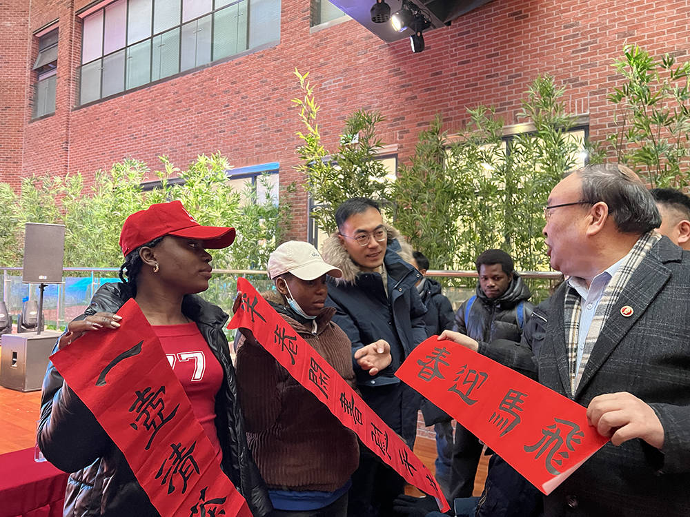 最具有中國(guó)人過(guò)春節(jié)傳統(tǒng)文化書法藝術(shù)成為全場(chǎng)的壓軸大戲。通過(guò)長(zhǎng)達(dá)數(shù)十余分鐘組織與天津財(cái)經(jīng)大學(xué)赤道幾內(nèi)亞、貝寧、泰國(guó)等外國(guó)留學(xué)生和孩子們互動(dòng),酈道元文學(xué)院簽約作家武新才等老師們不僅用精湛的書法當(dāng)場(chǎng)揮毫潑墨寫春聯(lián)福字,還當(dāng)場(chǎng)手把手教留學(xué)生和孩子們?nèi)绾螌懣㈦`、行、草、篆書,普及書法知識(shí)和中國(guó)傳統(tǒng)文化,弘揚(yáng)傳統(tǒng)文化藝術(shù),幾名留學(xué)生用毛筆寫出了福字,當(dāng)場(chǎng)展示給觀眾時(shí),全場(chǎng)掌聲雷動(dòng)歡聲笑語(yǔ),把喜迎新年的聯(lián)歡會(huì)推向高潮,送上提前拜年暖暖的中國(guó)年味,感受到傳統(tǒng)文化藝術(shù)美好!