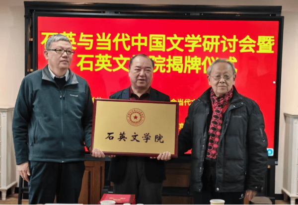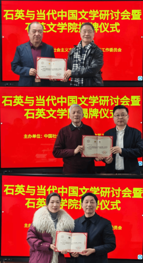 李正忠名譽(yù)會(huì)長(右)、祝東力顧問(左)共同為“石英文學(xué)院”揭牌,冷雪松常務(wù)副院長(中)接牌