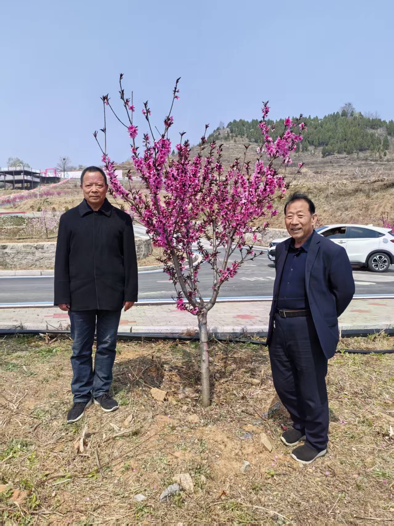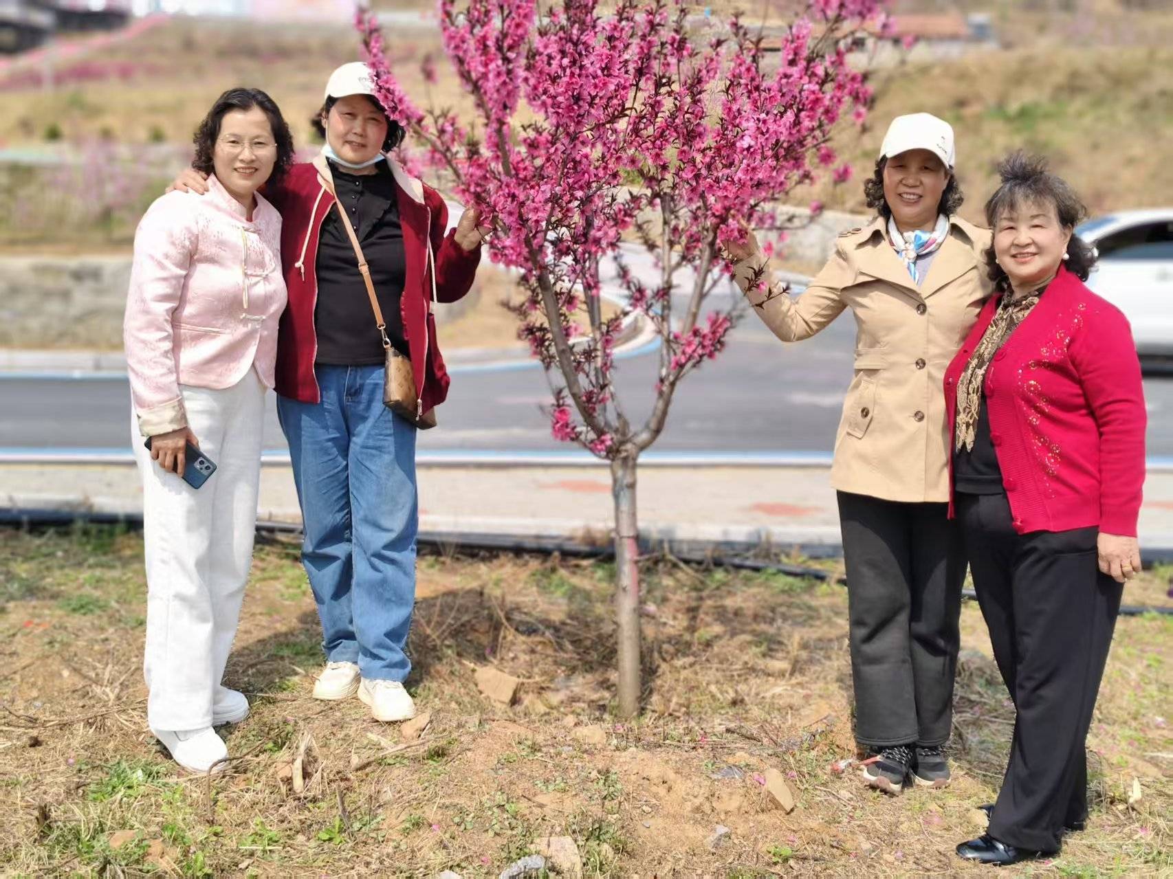 6. 車(chē)外桃花映臉紅:車(chē)外漫山遍野粉嘟嘟的桃花正在盛開(kāi),把車(chē)內(nèi)文友們的臉頰都映照得通紅。
